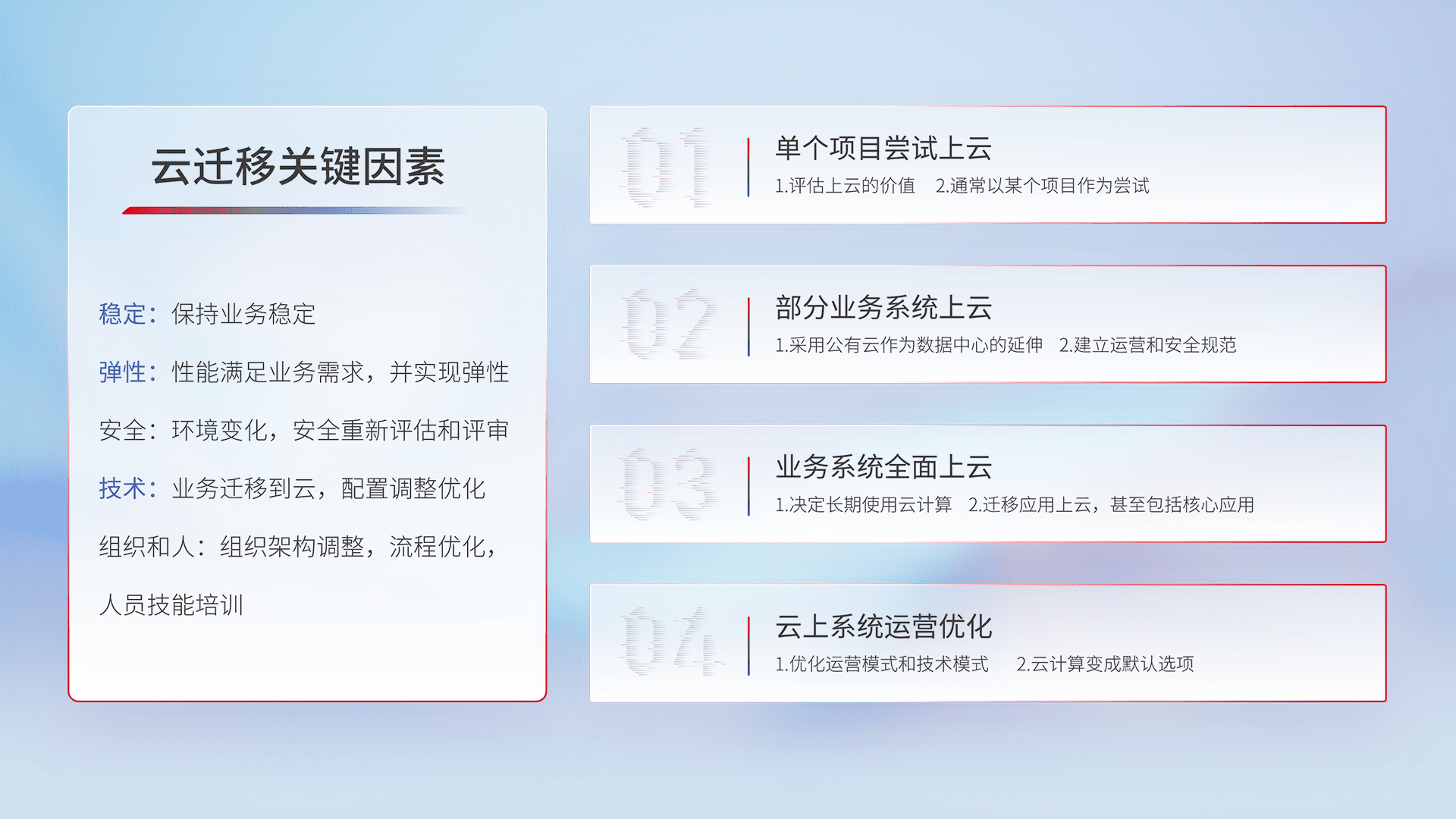 结合实际业务,,,,从规划设计、、、、云平台选型、、、云原生改造、、、数据迁移、、集成交付,,,,迁移全过程为客户识别最佳上云路径,,,做好风险识别管理,,设计网络架构、、、身份权限、、、、安全审计合规、、、操作审计、、日志审计、、监控告警策略、、、多站点容灾设计等,,对云上基础设施进行整体规划,,,,提升IT治理水平,,,以满足弹性、、、高可用、、、、高性能的需求。。